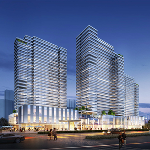 項目裙房集精品零售、酒店休閑、餐飲娛樂為一體,注重建筑形體與空間的整體環(huán)境效果,倡導(dǎo)采用開放式街區(qū)理念,增加交往公共空間的設(shè)置,通過設(shè)置外連廊、底層架空等方式提供戶外活動的場地與空間。裙房上部設(shè)三棟酒店式公寓,形成圍合式布局,采用現(xiàn)代風(fēng)格立面通透、明亮,同時發(fā)展垂直綠化屋面綠化等多種形式的立體綠化,創(chuàng)造宜居的辦公和居住環(huán)境。