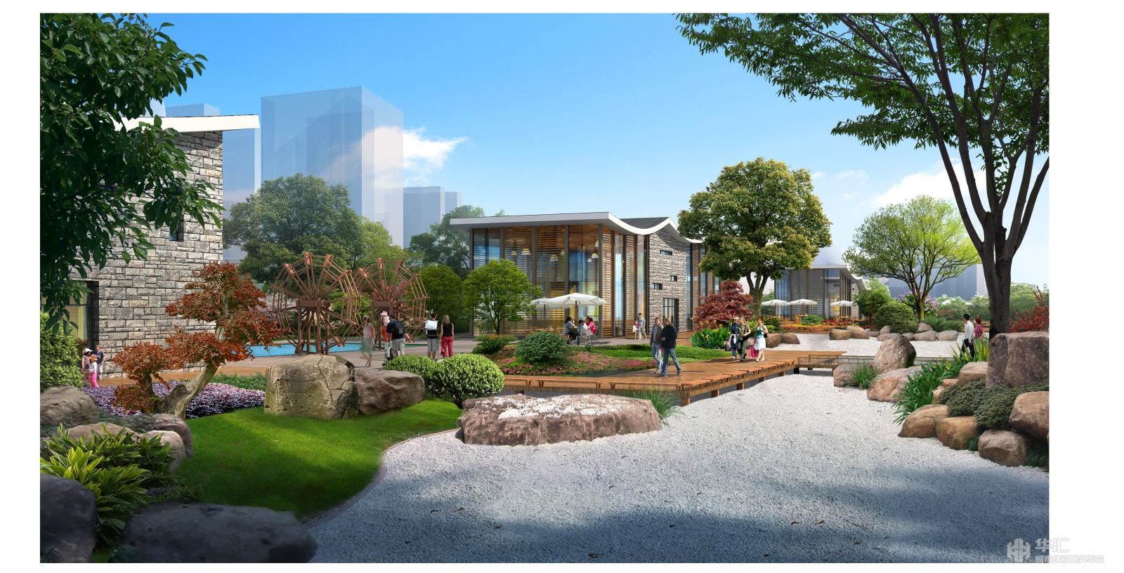 江城路與職教路范圍內(nèi)場地用地較為狹長,沿江濱西大道西北側(cè)規(guī)劃建筑以商業(yè)辦公綜合體為主要功能屬性,為適應(yīng)商務(wù)辦公人群對休閑放松的需求,以“靈秀”為景觀主題,,通過提取《富春山居圖》中“島”的元素,將原有泵房水源引入場地,分割狹長場地,形成島狀景觀。設(shè)計小型休閑建筑散落布置“島”上,引入茶室、咖啡、休閑餐飲等實用業(yè)態(tài),形成風(fēng)情景觀街區(qū),構(gòu)建“島居”景觀風(fēng)貌。