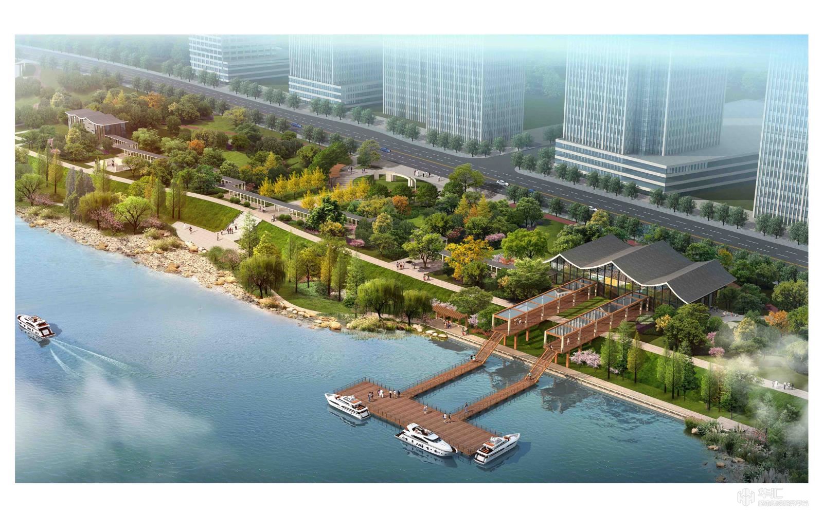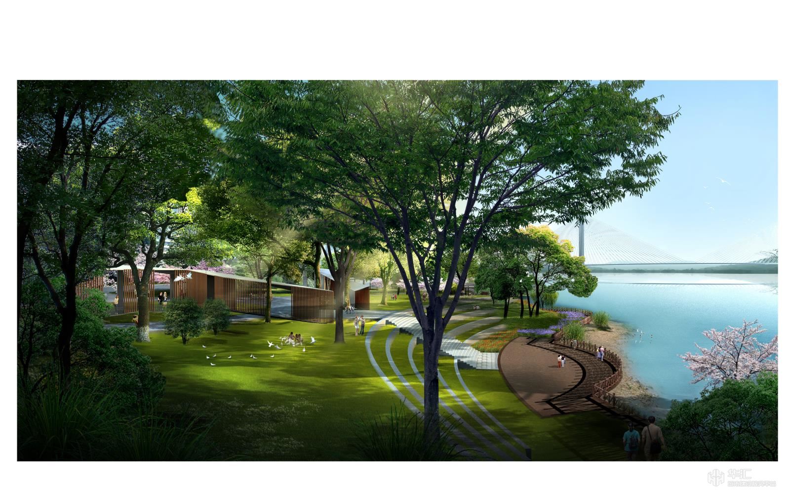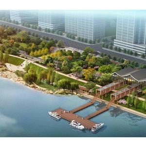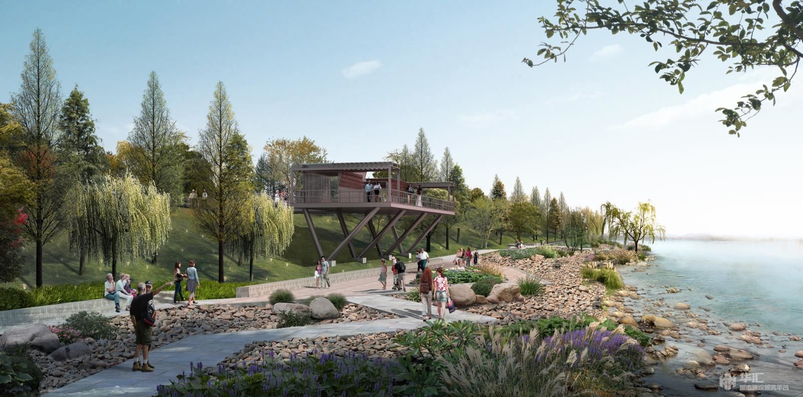 場地內(nèi)有一條橫貫?zāi)媳钡姆篮榈?,天然高差使江岸景觀與江濱西大道以北地塊形成天然分割,堤頂至江邊的土坡和駁岸自成體系。設(shè)計提取《富春山居圖》中的“水”元素,以觀賞遼闊江景為出發(fā)點,設(shè)置不同層級濱水棧道、浮動式游船碼頭、架空式觀光棧道,并結(jié)合現(xiàn)狀情況配置水生植物,保留并改造卵石灘,在不同水位情況下,游人都能欣賞到豐富類型的濱水景觀,展現(xiàn)豐富的“水居”景觀風(fēng)貌。