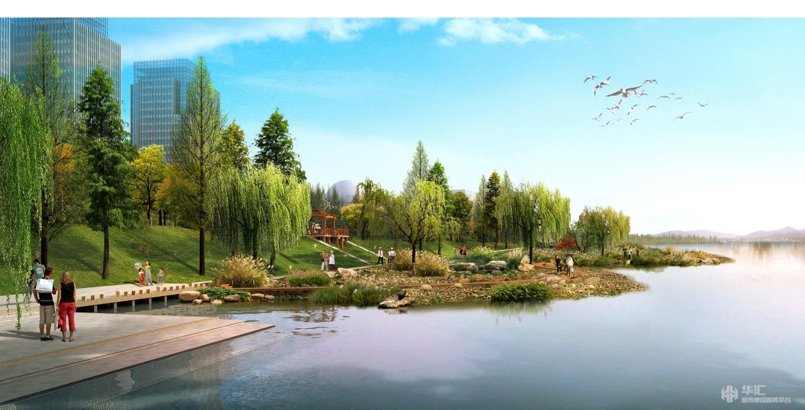 其中,以“山”之雄奇襯托文化行政區(qū)核心地位,以“島”之靈秀適應(yīng)商務(wù)辦公人群放松心情需求,以“林”之閑適呼應(yīng)文體休閑區(qū)域精神品質(zhì)。此外,以“水”為設(shè)計主題,承接富春江的遼闊壯美。從而實現(xiàn)景觀內(nèi)涵與周邊功能的完美對接。