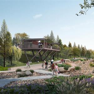 職教路至大塢溪段,景觀場地逐步開闊,有較大進(jìn)深腹地,現(xiàn)狀植被茂盛,設(shè)計擬保留較好綠化資源,提取《富春山居圖》里“林”的景觀意向,配合周邊體育休閑用地性質(zhì),以“閑適”為主題,林中穿插結(jié)合游步道、觀鳥平臺等,提供林間漫步、陽光運動、科普娛樂等功能,形成“林居”景觀風(fēng)貌。