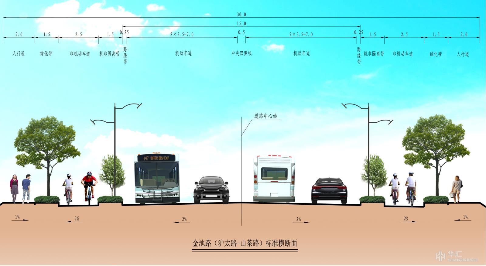 金池路位于上海市寶山工業(yè)園區(qū)BSP0-1801單位的西南部,規(guī)劃為城市次干路。本次設(shè)計(jì)范圍西起滬太路,東至山茶路。道路設(shè)計(jì)全長(zhǎng)為約1836m,紅線寬30m。根據(jù)金池路在路網(wǎng)規(guī)劃中位置及功能確定道路的橫斷面布置形式為三塊板的形式,斷面方案如下:3.5m人行道+2.5m非機(jī)動(dòng)車道+1.5m機(jī)非分隔帶+15m機(jī)動(dòng)車道+1.5m機(jī)非分隔帶+2.5m非機(jī)動(dòng)車道+3.5m人行道=30m。