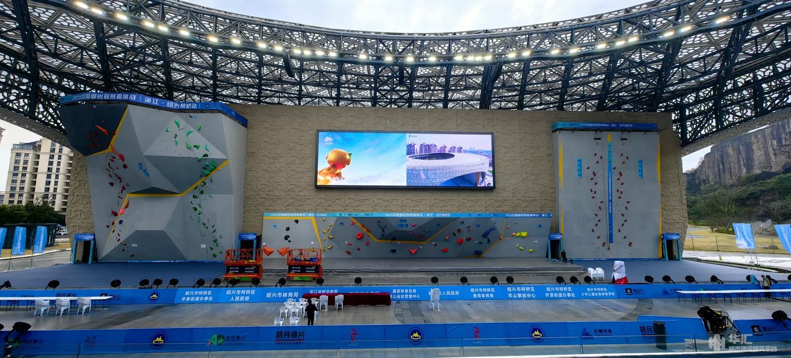 場地分為南北兩區(qū),南區(qū)為比賽場地,最上方是現(xiàn)場直播大屏,下面按國際標(biāo)準(zhǔn)打造的三個攀巖賽道,整體巖壁高16.5米,總寬度約68.5米,最大懸挑9米,坐南朝北,面向觀眾席一字排開。賽道由速度道、攀石道、難度道三部分構(gòu)成。巖壁朝北設(shè)置,可讓運(yùn)動員在比賽時背對陽光,避免因光線刺眼影響比賽。北區(qū)則是觀眾區(qū),賽時可容納觀眾2100人。