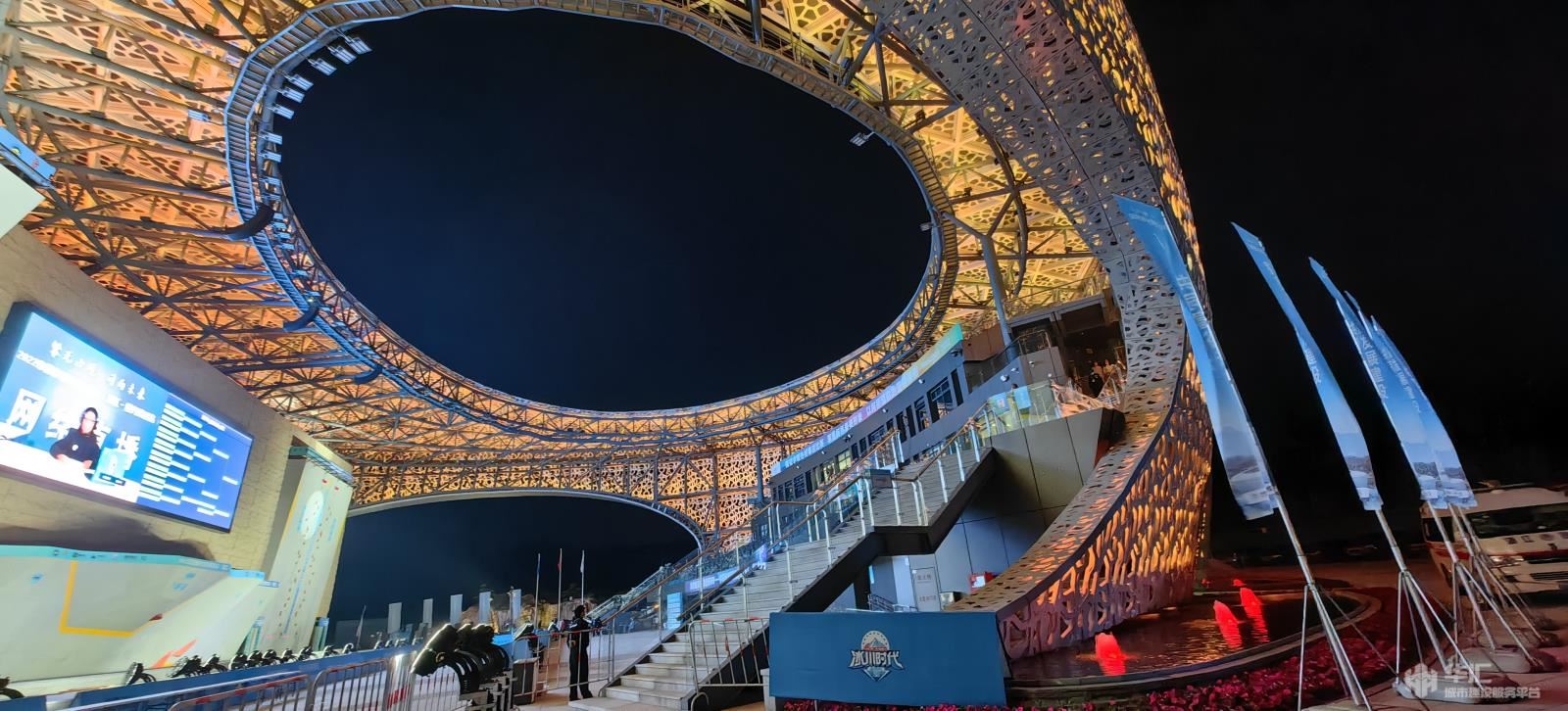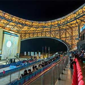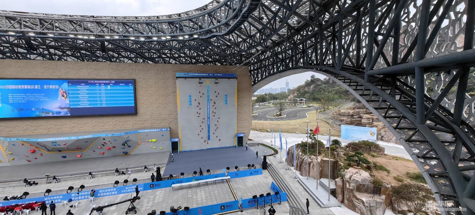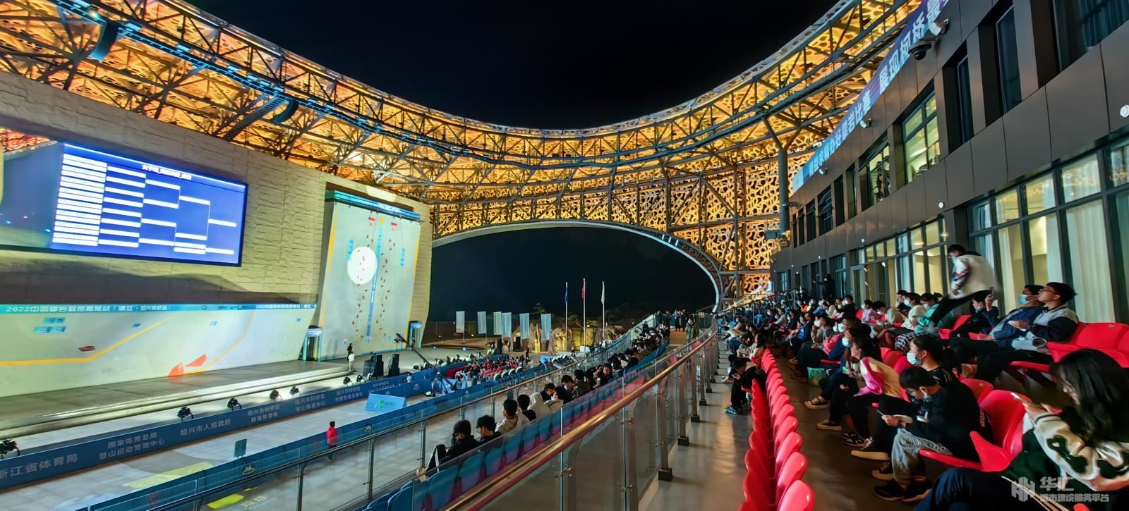 踏入場館,遠(yuǎn)遠(yuǎn)望去,整個場館呈“蠶繭”形,場館屋頂除了滿足攀巖比賽遮蓋要求,盡最大可能開啟了天空與景觀,2000年《西游記》第九集《祈雨鳳仙郡》拍攝取景的羊山石城景區(qū)成為了場館最美的背景映襯。