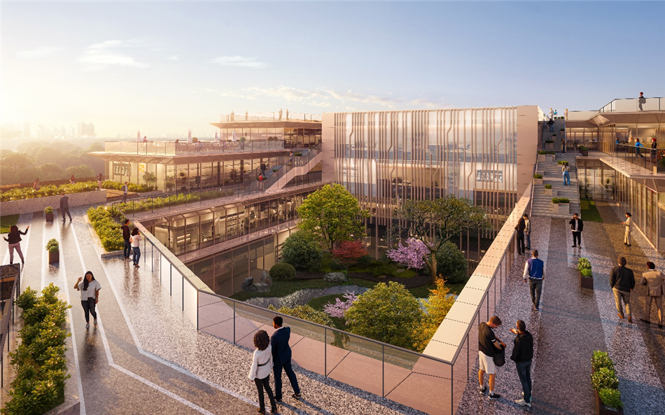 多維景觀、激發(fā)活力:最大程度發(fā)掘外部景觀資源,采用層層退臺的設計手法;圍合的建筑形態(tài),營造內部花園式工作場景。注重第五立面設計,創(chuàng)造多層次,高格局的景觀系統(tǒng),打造多層次、多維度、多層級的公共空間。