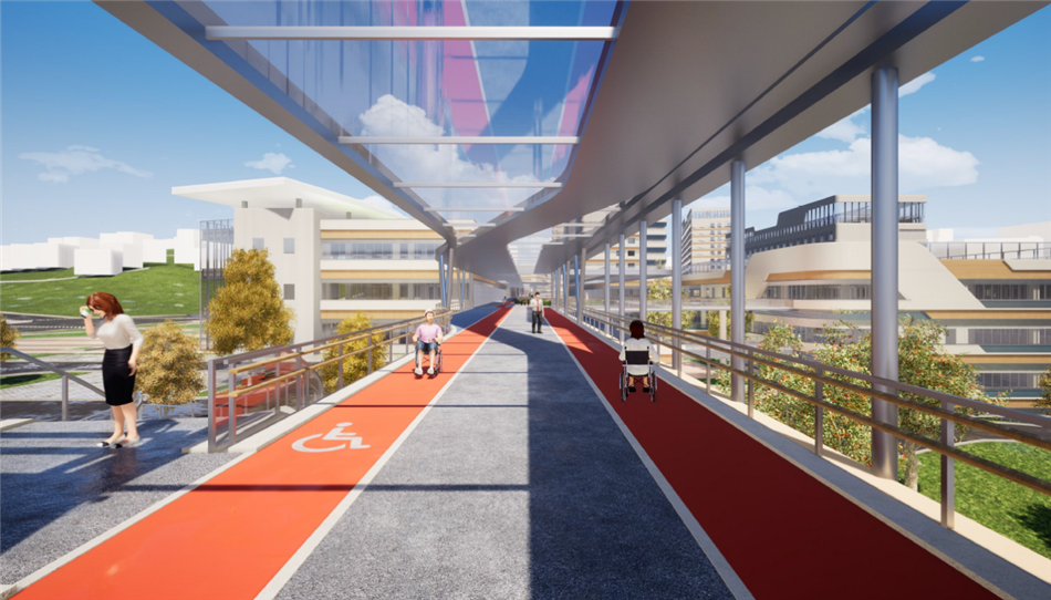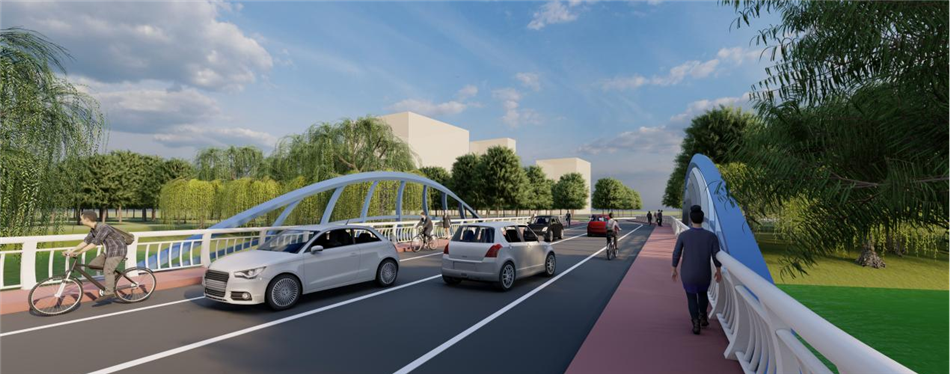 本次互聯(lián)互通工程分項(xiàng)內(nèi)容主要由慢行互聯(lián)和車行互通兩部分組成。慢行互聯(lián)包含三段綠谷連廊,共計(jì)672米。車行互通包含兩座跨河道景觀橋梁,其中,跨面店河橋1號(hào)橋長41米、寬15米,2號(hào)橋長25米、寬15米。