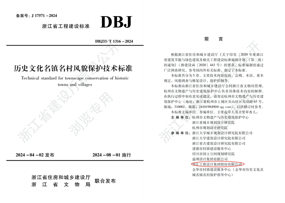 近日,由集團(tuán)參編浙江省工程建設(shè)標(biāo)準(zhǔn)《歷史文化名鎮(zhèn)名村風(fēng)貌保護(hù)技術(shù)標(biāo)準(zhǔn)》(DBJ33/T 1316-2024)、安徽省地方標(biāo)準(zhǔn)《既有建筑改造設(shè)計(jì)指南》(DB34/T 4711-2024)兩項(xiàng)標(biāo)準(zhǔn)獲正式發(fā)布。